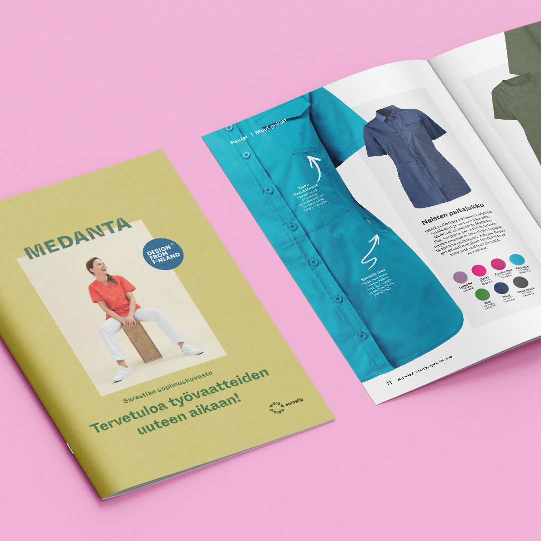 Tuore esimerkki on työvaatemallistoamme esittelevä katalogi. Päädyimme printtituotteeseen, koska halusimme tavoittaa terveydenhuoltoalan ammattilaiset työpaikoillaan. Katalogin selkeä sisältö palvelee vaatteiden käyttäjiä ja sen raikas visuaalinen ilme – kuvat, fontit, taitto – rakentavat laatuun perustuvaa mielikuvaamme. Halusimme tehdä katalogista houkuttelevan lukupaketin, joka kuluu käsissä esimerkiksi sairaaloiden kahvihuoneissa.
